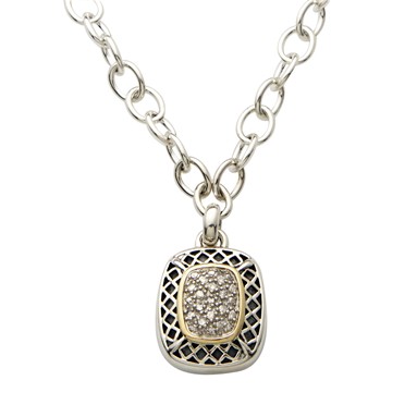 Contemporary yet classic. What a beautiful combination. Diamond necklace on an 18" heavy cable link chain with a toggle clasp, .15twt round diamonds, set in 14k yellow gold and sterling silver.