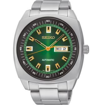 Seiko Recraft Series. This automatic watch is powered by the movement of the wearer's wrist. Energy efficient movement with a power reserve of approximately 41 hours. The timepiece has a stainless steel case and bracelet. Features a green dial, day/date calendar and a screw down see-through case back. 50 meters water resistant.