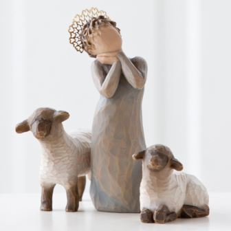 Behold, a little love on earth. As a Christmas gift, wedding gift or self-purchase, the Little Shepherdess can be added to the Willow Tree Nativity collection that will continue on as a family tradition. “I view this angelic figure as an earthly personification of love. Her gaze and gesture is one of adoration. The smoky blue color of her dress grounds her, as do the two wooly lambs she tends. I wanted her to complement the taller shepherdess figure, Peace on Earth. Together, with the other shepherds and animals, they radiate warmth, love and peaceful attentiveness." -Susan Lordi