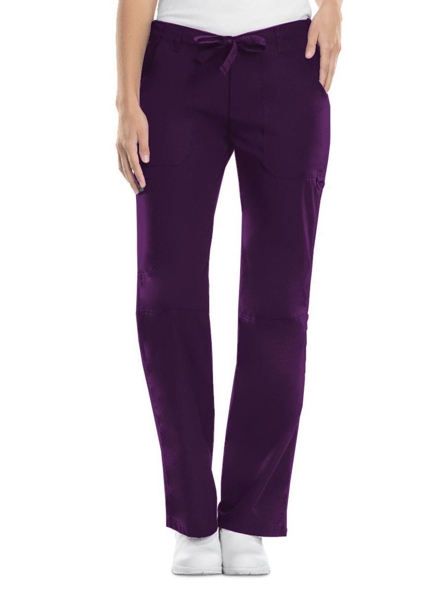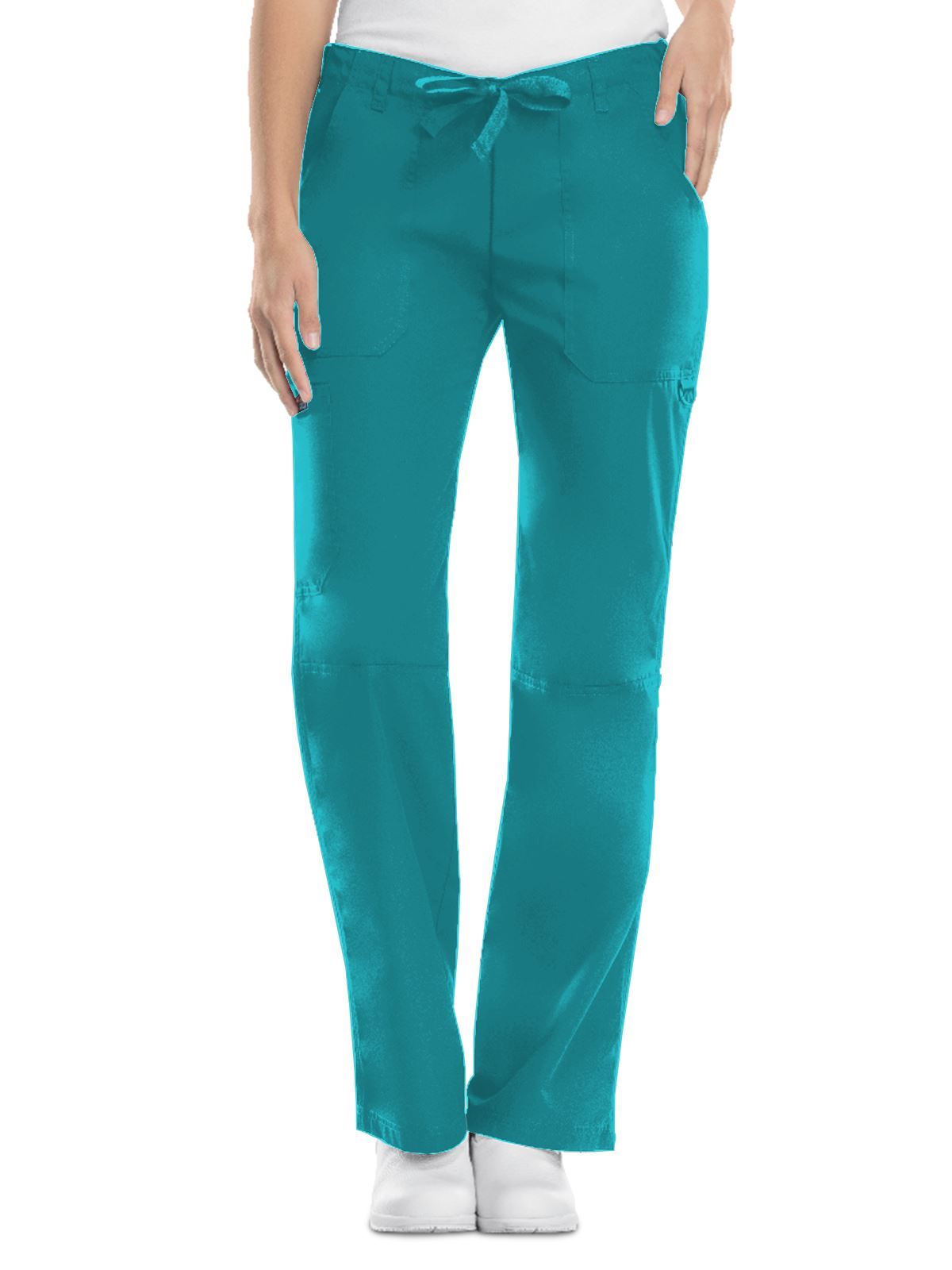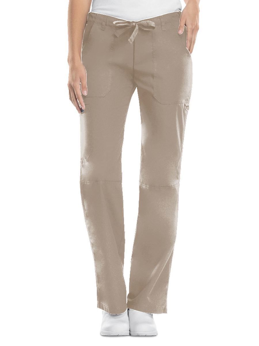 Fabric: 65% Polyester, 35% Cotton Poplin with Soil Release Features: This low-rise, straight leg, drawstring pant with an elastic waist features a contemporary fit. Two front pockets, a d-ring on the left cargo pocket, an extra cargo pocket and one scissor pocket, leg seaming detail at the knee, five belt loops and double needle top stitching complete this extraordinary pant. Regular inseam: 31". Petite inseam: 28½". Tall inseam: 34".