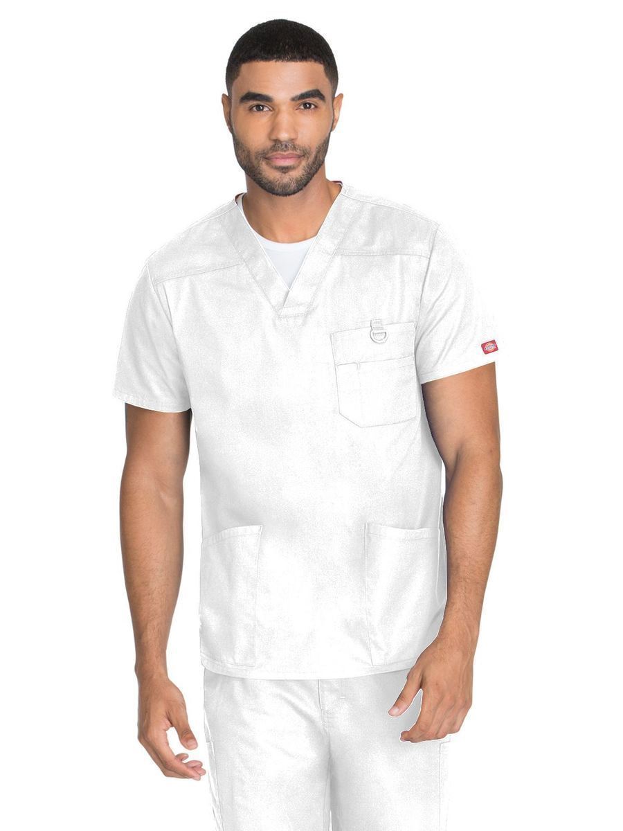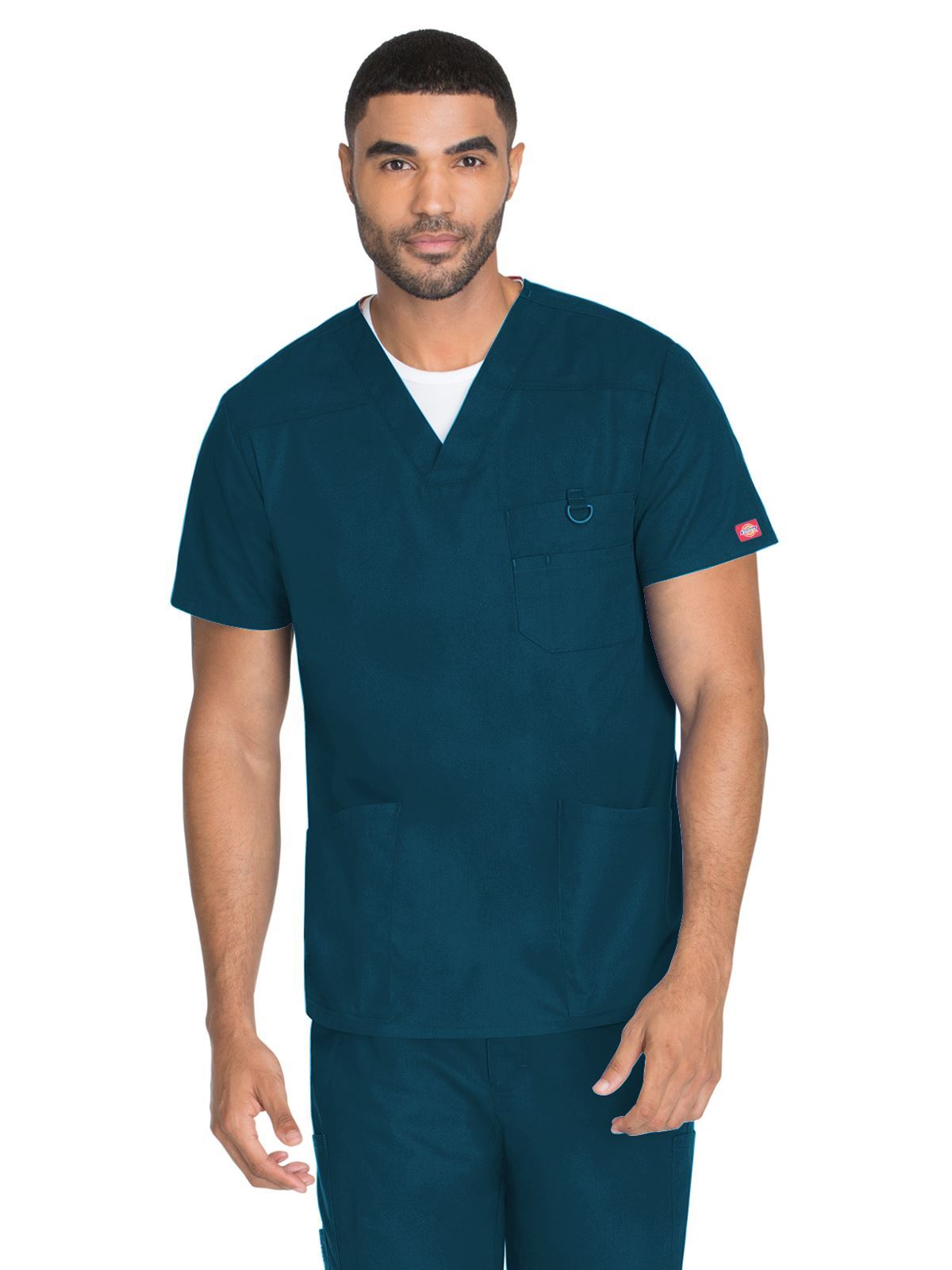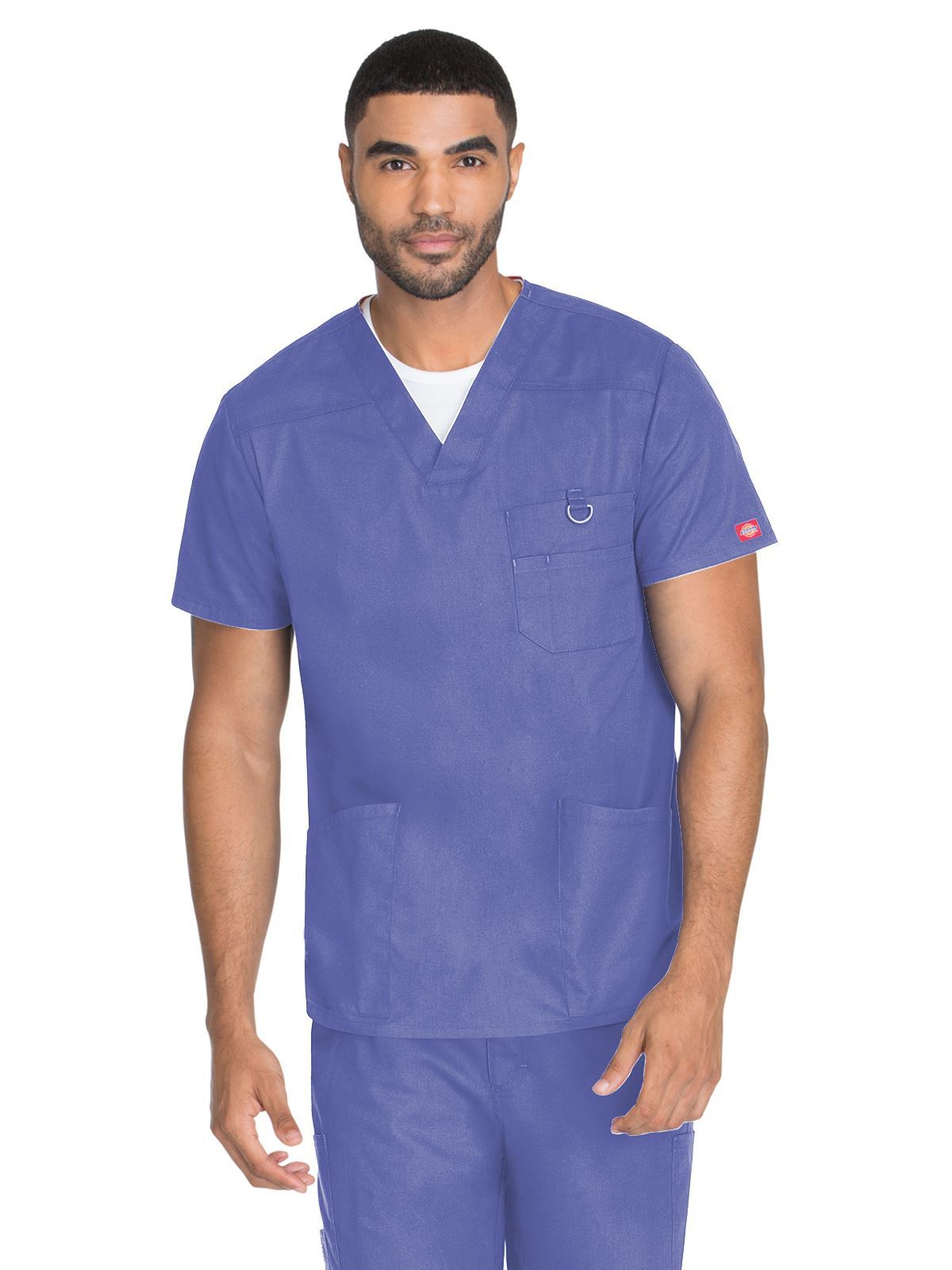 A men's v-neck top features Dickies logo twill tape at the back neck, a double chest pocket with self strapping and a D-ring. Also featured are patch pockets, a stretchy knit interior pocket, a back yoke, a center back seam, and side vents. Center back length: 29".