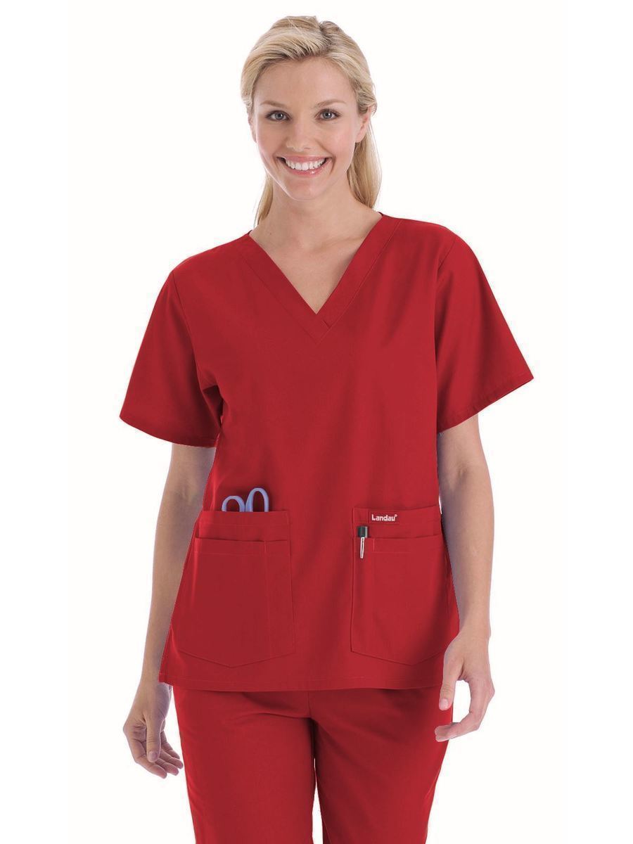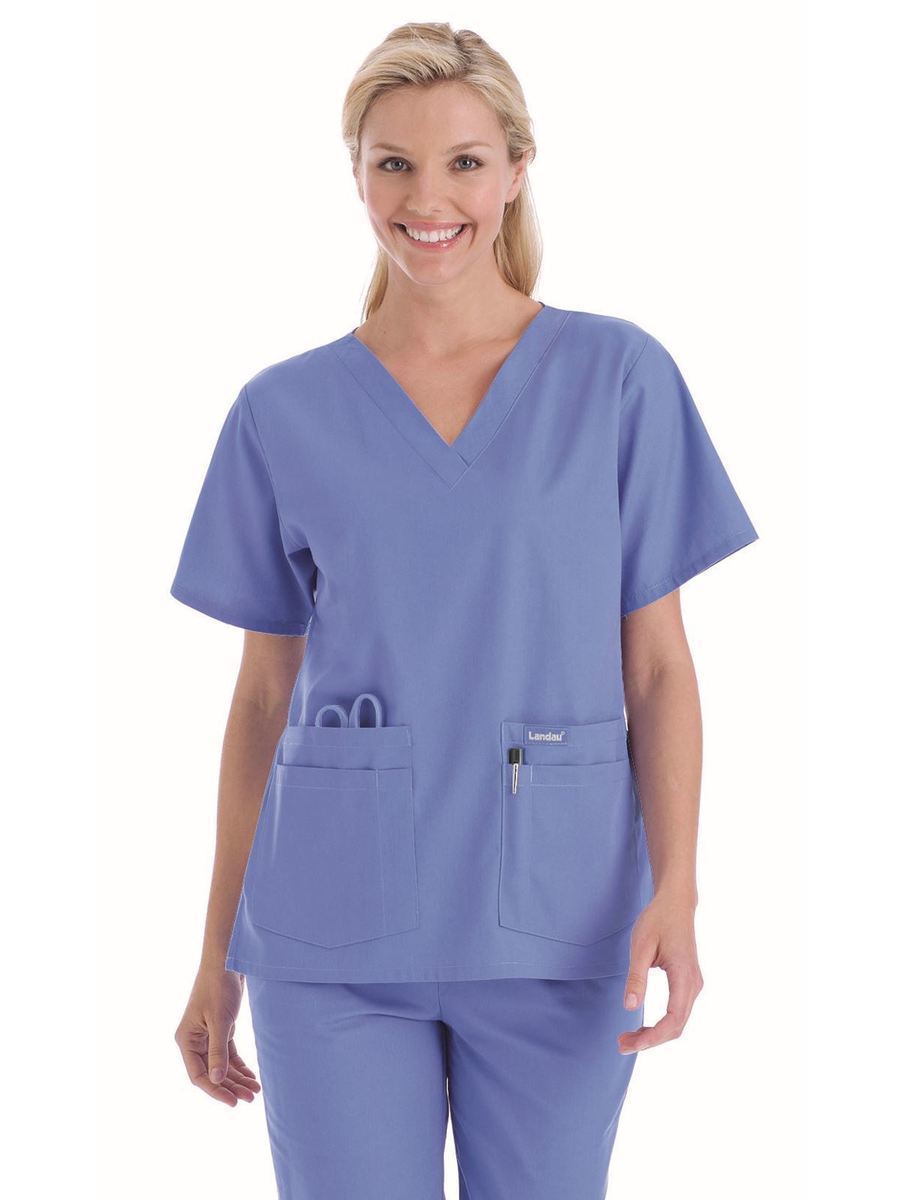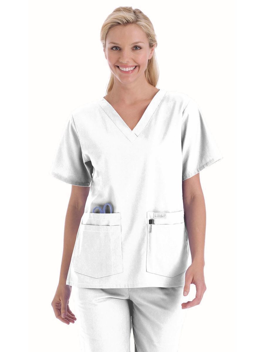 A classic that comes in almost every color and print you can imagine--good luck deciding! A v-neck top with set-in sleeves and four pockets with pencil/instrument division. Four-inch side vents. Center back length: 27¼".