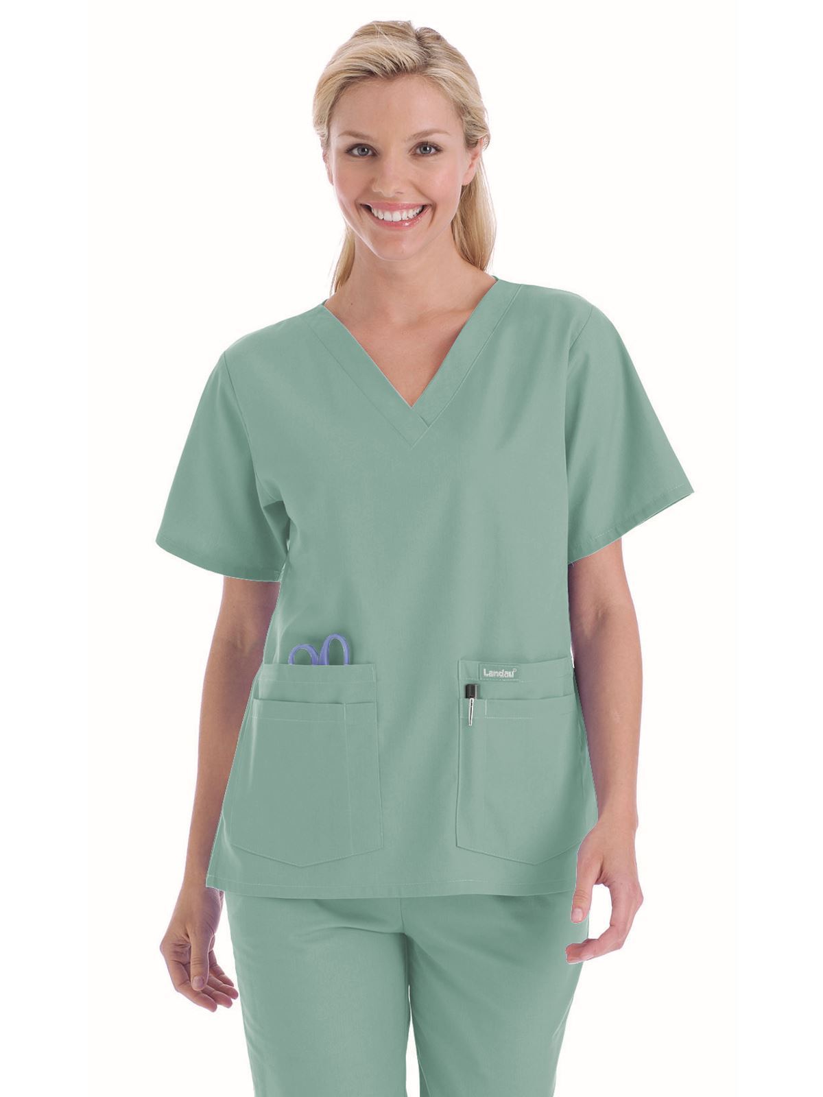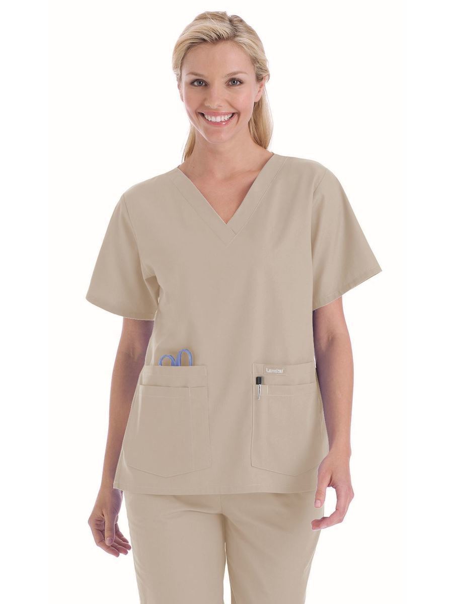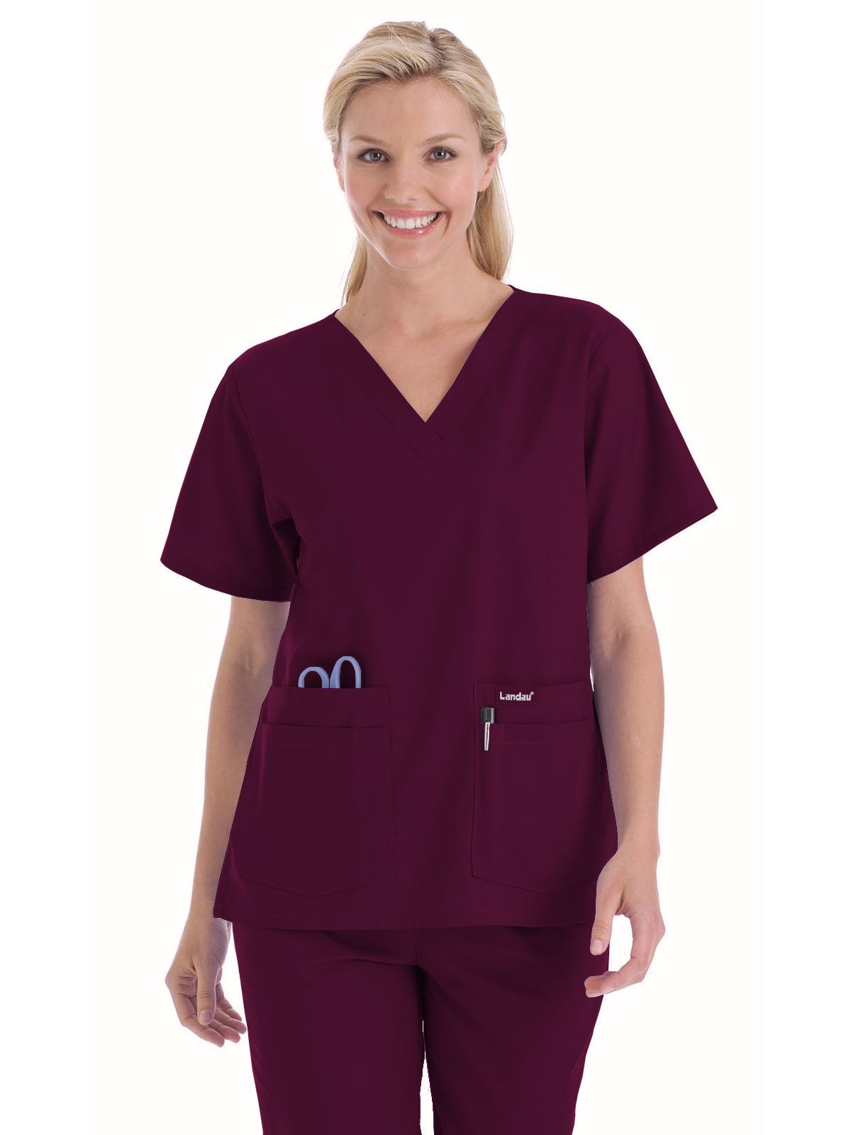 A classic that comes in almost every color and print you can imagine--good luck deciding! A v-neck top with set-in sleeves and four pockets with pencil/instrument division. Four-inch side vents. Center back length: 27¼".