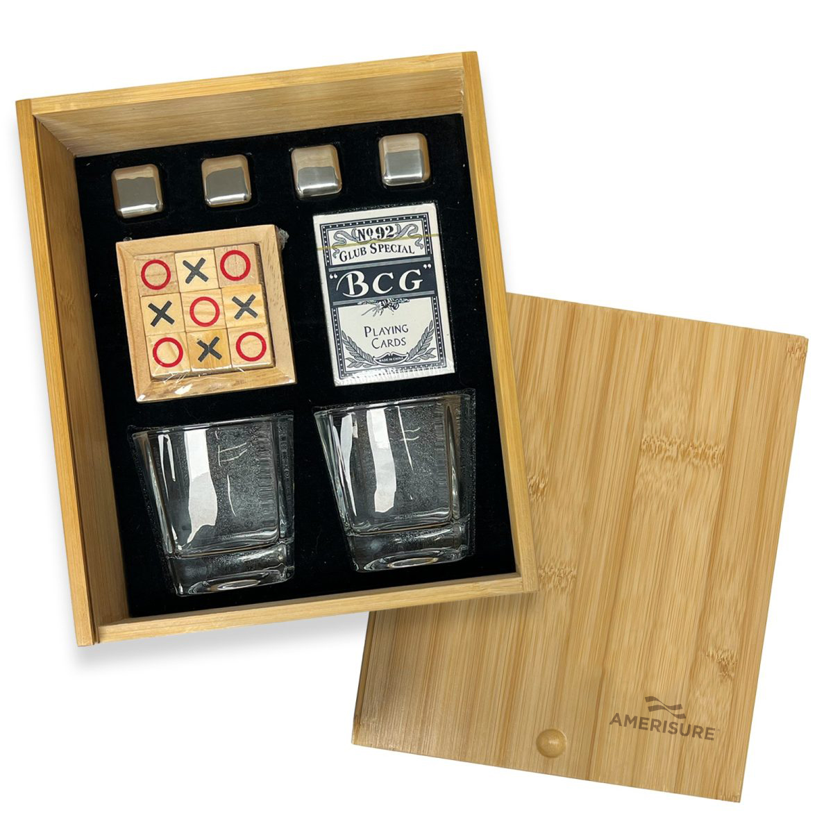Introducing the Game Night Gift Set, the perfect companion for your next gathering! This thoughtfully curated set includes a deck of playing cards, two rock glasses, and four stainless steel ice cubes, all elegantly packaged in a bamboo gift box. The bamboo box features a slide-off top that reveals tic-tac-toe squares on the reverse side, adding an extra layer of fun to your game night.
