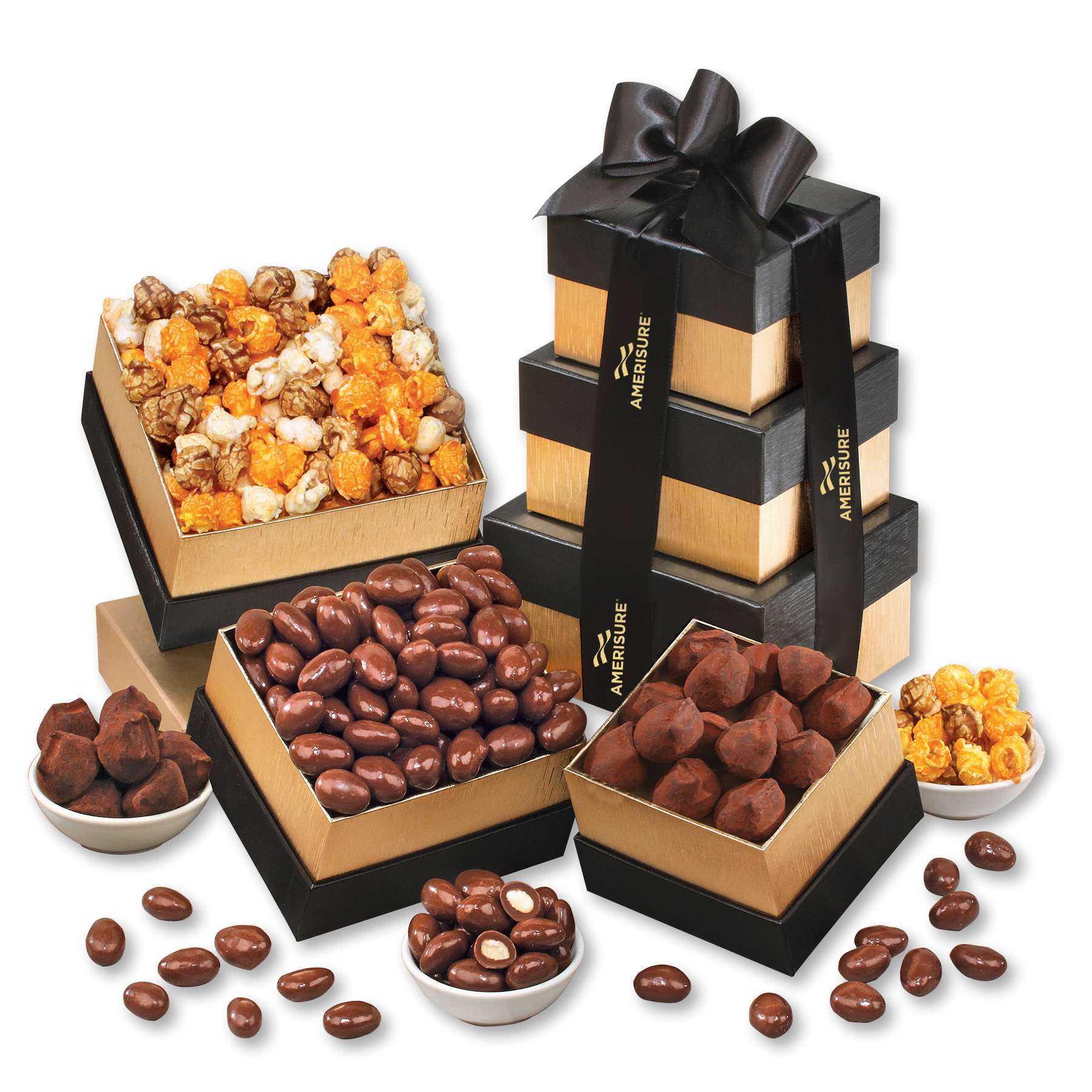 Familiar and new flavors fill this chic tower. Its three gold and black boxes contain a little sweet, a little salty, a little creamy, and a lot memorable. We tie it all together with black satin ribbon foil-stamped in gold with our brand. They're sure to be wowed by this charming gift!