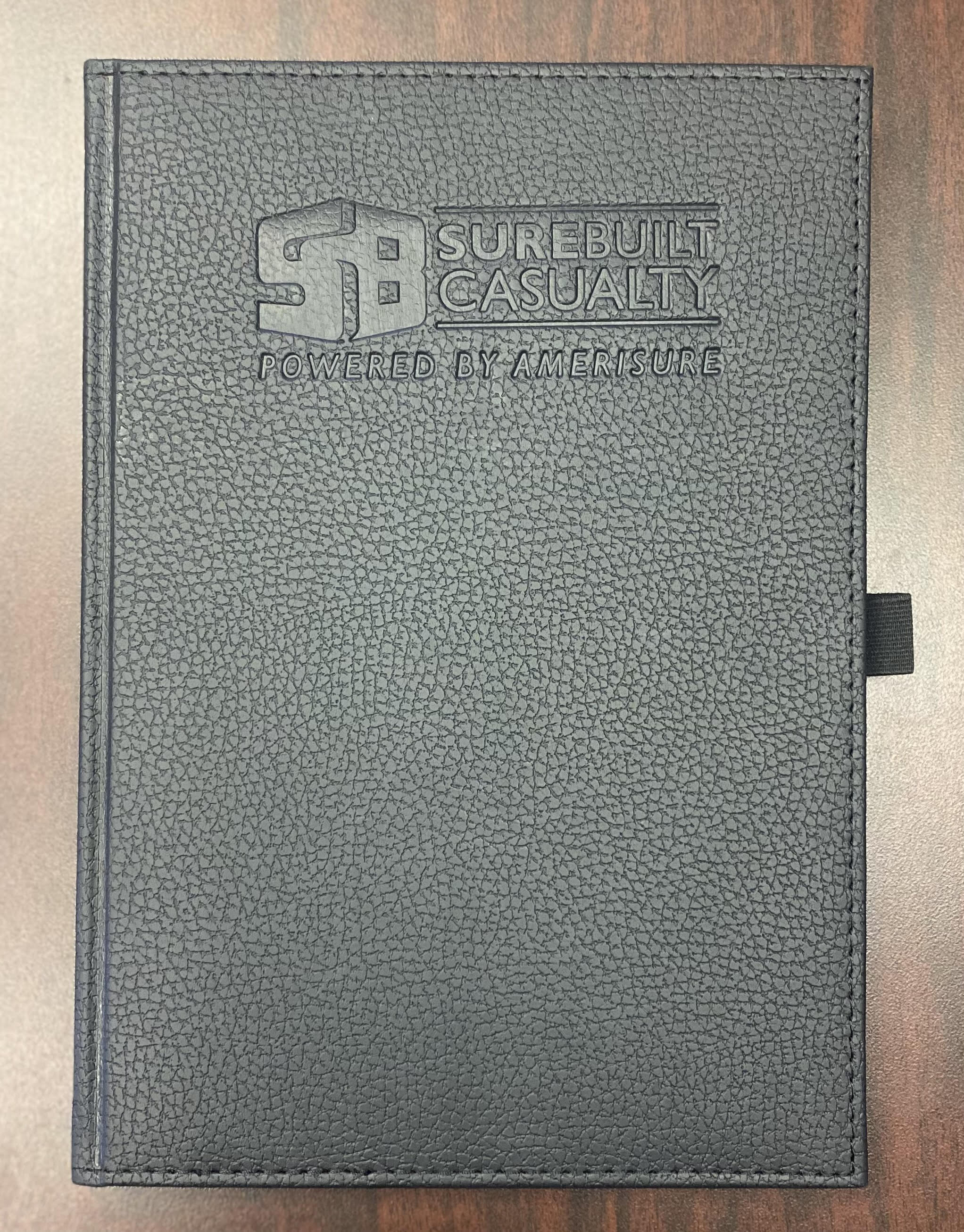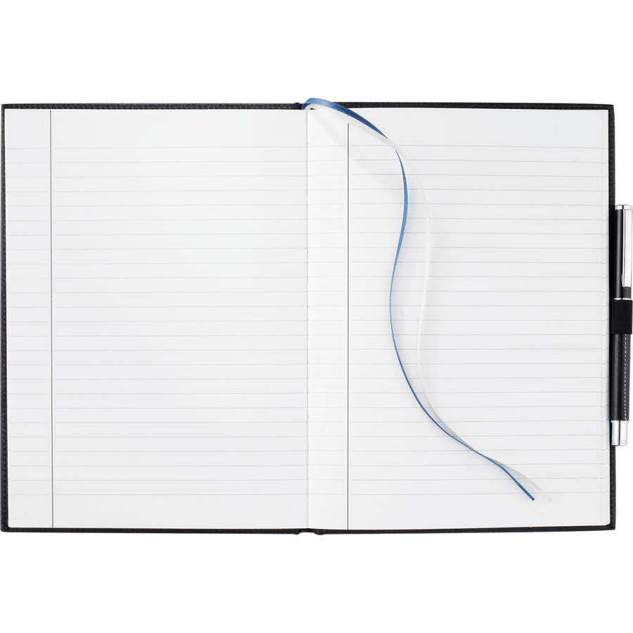 Hard cover, pebble grain bound journal. Elastic pen loop. Blue and silver ribbon page markers. Includes 96 sheets of white lined paper.Pen is not included. 10" H X 7" W X 1" D.