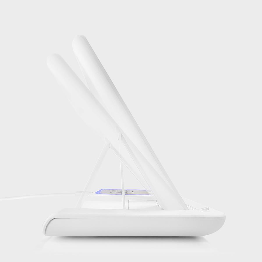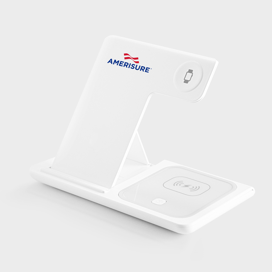 Experience the convenience of the LED Wireless Recharging Station! Designed around a blazing fast 15 watt Qi charging phone stand that features our brand, this item also includes a built in Apple Watch charger, a charging station for any Qi earbuds and a LED light. Truly an all-in-one design that makes the perfect gift. Packaged in a white tuck box (6.75"H x 7"W x 6/8"D). Prop 65 certified.