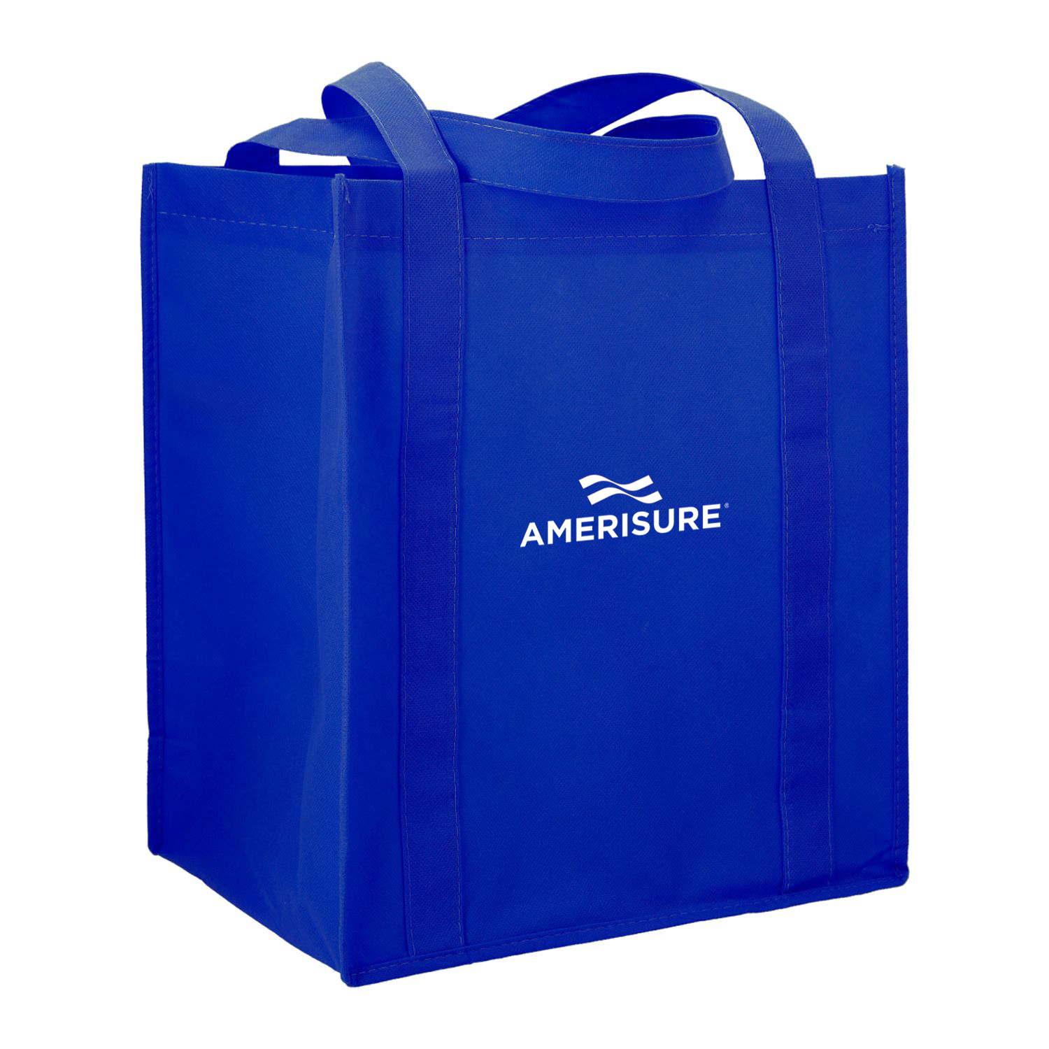 The Little Juno Non-Woven Grocery Tote features an open main compartment with double 22" reinforced handles and a supportive bottom board to hold your items securely. Constructed from recyclable polypropylene materials, this reusable tote is an environmentally responsible alternative to plastic bags.