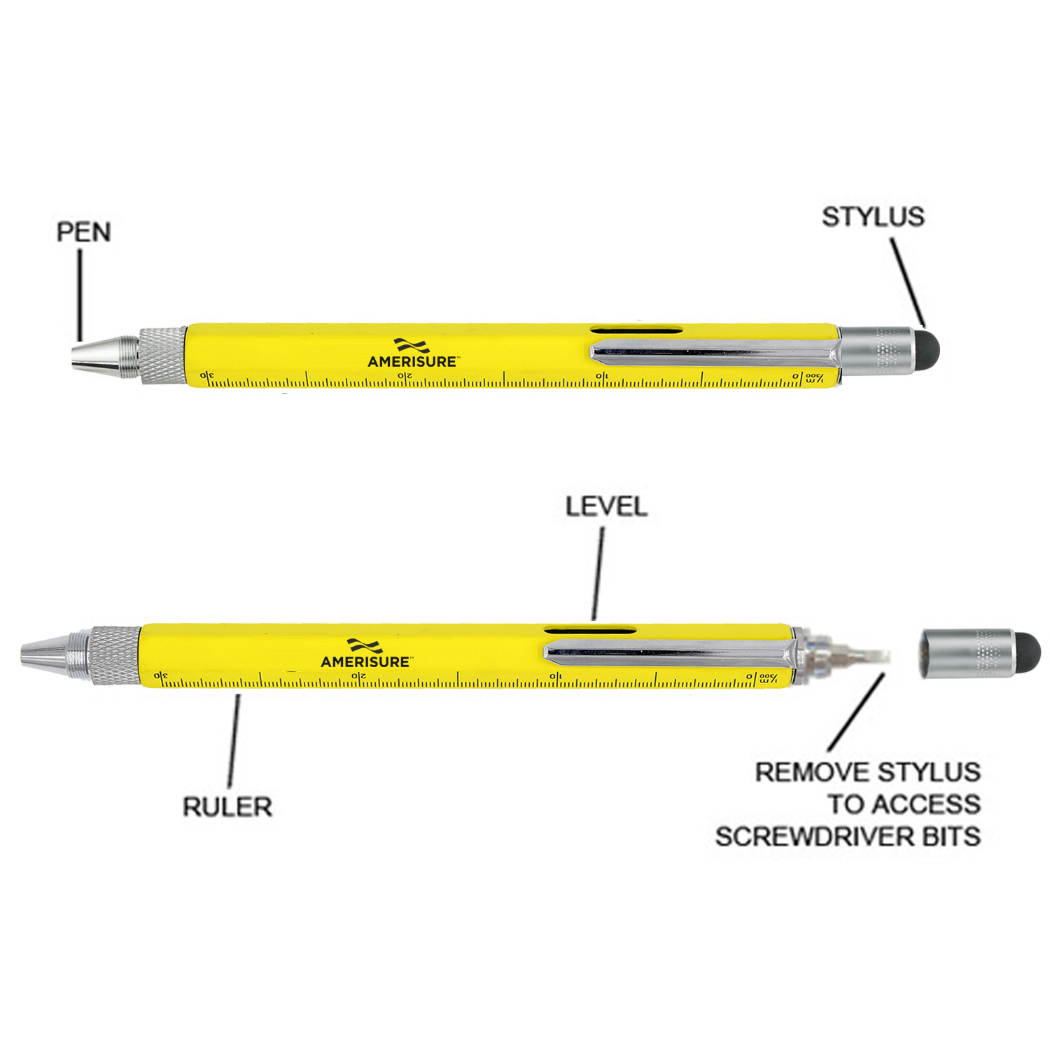 This innovative pen/stylus tool will come in handy for many uses. Remove the stylus top to gain access to the multiple screwdriver bits inside which will magnetically connect to tool. In addition there are multiple ruler markings on the side and a built in level.