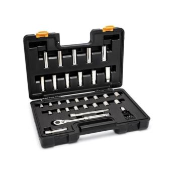 36 piece mechanics tool set that features 3/8" drive 72-tooth teardrop shaped ratchet head with on/off switch and a bit adapter, extensions and useful bits for a variety of applications. It includes 12 Point standard and 6 Point deep sockets in both SAE and metric sizes. It features a quick relese design for rapid socket removal; bright, full polish chrome finish that easily wipes clen and resists corrosion; and a black blow mold case for storage and organization. Meets or exceeds ASME specifications.