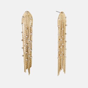 Bring full-volume drama to any movement. These earrings are ready to make a bold, high-impact statement. Layered fringe construction for dynamic movement. Embellished glossy gold design. Accented with sparkling glass stones. Statement size that instantly elevates any look. Style with swept-back hair and let the fringe do the talking.