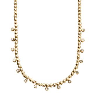 Effortlessly elegant, you'll be reaching for this crystal pisa necklace on repeat. Classic gold pisa beads sit alongside shimmering bezel crystals. Secure lobster clasp ensures this necklace stays comfortably in place. Generous 3" extender makes adjusting length easy - don't be afraid to layer! Lightweight and easy to wear all day. A refined take on everyone's favorite beaded necklace, this can be used to elevate everyday outfits or complement upscale looks.