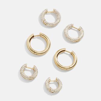Three times the earrings, three times the layering. The Lucy Earring Set is complete with three pairs of huggie hoop earrings. Two pairs are encrusted with crystals, while the third is crafted in graphic gold. Wear a few together or break them apart for easy stacking every single day.