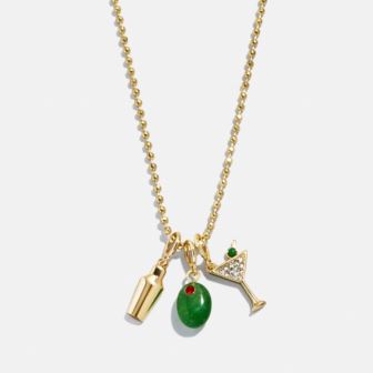 Shake (or stir) things up with this fun homage to your favorite drink. Decorated with an olive charm, dirty martini charm, and a cocktail shaker charm. Crafted with pisa beads throughout the chain. Lightweight and easy to wear. Pair this necklace with your go-to golds or wear it solo to happy hour and beyond