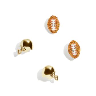 Kick off a new ear stack with studs that always score a touchdown. Introducing the Draft Pick Earring Set, football and helmet stud earrings crafted with glittering glass stones. Wear these earrings to games, tailgates, and watch parties to score major style points with any crowd. Please note this only comes with two sets of earrings, the football helmets and footballs.