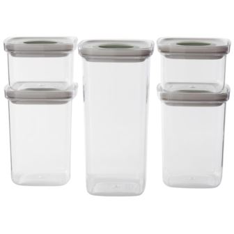 Keep your kitchen organized and your food fresher for longer with the Leo 5pc smart seal food container set. Designed for versatility and durability, this set has five food containers in varying sizes, perfect for everything from meal prep and leftovers to dry goods and snacks. Each container is crafted from transparent, high-quality plastic that lets you see contents at a glance, while the Smart Seal twist-lock lids create a 100% airtight and leak-proof seal. Whether you're storing soup, salads, pasta, or pantry staples like flour and cereal, these containers are built to keep moisture and air out, preserving flavor and freshness. The innovative twist-lock mechanism is easy to use, making opening and sealing a breeze. BPA-free, stackable, and space-saving, these containers are as practical as they are sleek. With the Leo smart seal set, you're not just organizing your food but you're simplifying your life in the kitchen. Set includes: 4.75" x 3" Food Container 0.42qt. (54oz), 4.75" x 6" Food Container 1.1qt., 4.75" x 9" Food Container 1.7qt., 9.5" x 6" x 2.25" Food Container 0.74qt. (24oz), 9.5" x 6" x 3.25" Food Container 1.6qt.
