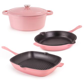 Neo 4pc Cookware Set combines style and functionality for all your cooking needs. Each piece is crafted from high quality cast iron and features a durable enameled body, eliminating the need for preseasoning and ensuring easy maintenance. The fry pan and grill pan are designed with helper handles and pour spouts to easily transfer and drain your dishes. Use the grill pan to create homemade paninis, meaty steaks and chicken breasts with perfect grill marks or make succulent lamb chops, crispy bacon, and even a delicious cake with the fry pan. The Dutch oven comes with a vapor seal lid, enhancing its versatility for simmering, braising, and roasting. Compatible with all cooktops such as gas, electric, ceramic, glass, and induction and oven-safe up to 535°F. Hand wash only. Set includes: 10" Fry Pan, 11" Square Grill Pan, 5qt Oval Dutch Oven with Lid. Available in 9 colors: Blue, Green, Meringue, Orange, Oyster, Pink, Purple, Red, White