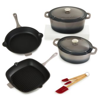 Neo 9pc Cast Iron Cookware with Silicone Spatulas Set is a modern collection that marries function, design and innovative use of materials to create an outstanding line of cast iron cookware. Coated with an enamel layer for a smooth, hygienic surface. The cast iron dutch ovens are ideal for slow cooking stews, braising, baking and so much more. Cook like a pro with the versatile dutch oven that can go effortlessly from browning on the stove top to roasting in the oven. Braise short ribs, make hearty stew, three bean chili, curry chicken, and so much more. The grill and fry pan are equipped with a helper handle and two pour spouts, making it easy to maneuver and pour out liquids without any spills or accidents. Utilize the silicone spatulas without scratching or damaging your cookware's surface. The enameled cookware set is suitable for all heat sources including, gas, electric, induction and ceramic. Oven safe up to 535°F. Set includes: Silicone 3pc Spatula Set, 8qt Oval Dutch Oven, 5qt Oval Dutch Oven, 10" Fry Pan, 11" Square Grill Pan, 2x Lids