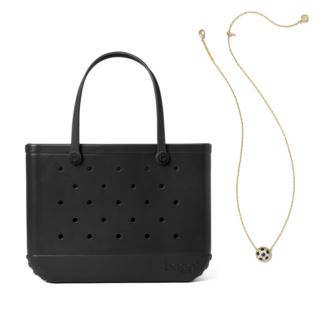 Make it the perfect sports day with this Bogg Bag x Kendra Scott bundle. Including the bag that started it all, washable, indestructible, and built to carry it all. The Original Bogg Bag is our largest, most spacious tote, perfect for beach days, big hauls, and everyday family adventures. Durable and tip-proof, it stands upright, wipes clean, and keeps up with whatever your day throws at it. Sand brushes off. Spills don't stick. Includes two clear insert bags, perfect for organizing smaller essentials. Bag Dimensions: 19" L × 9" W × 14" H. Weight: 3 lbs. Our largest, haul-it-all bag, fits 6 towels and every Bogg accessory. Pair with Kendra Scott's Soccer Short Pendant Necklace. Score major style points when you wear the Soccer Gold Short Pendant Necklace in Ivory Mother-of-Pearl. A shimmering soccer ball pendant complete with gunmetal detailing, this sporty style brings the spirit to every game.. 14K Yellow Gold Over Brass. Lobster Clasp W/ Single Adjustable Slider Bead. 19"Chain, 0.51"L X 0.49"W Pendant.