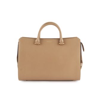 This Burberry Medium Banwell Shoulder Bag comes in chestnut beige leather and features the Burberry Check pattern in the classic beige color palette on the sides of the bag in a canvas material. The hardware is gold-toned, including the protective feet on the base. The interior includes a spacious main compartment for ample storage, a flat wall pocket, and the bag comes with an attachable leather shoulder strap. Dimensions: 15" x 10" x 6.5"; Strap Drop: 13.5" - 17.5".