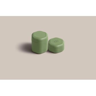 This set features one Medium Capsule (1.32 fl oz) with a blank label and one Small Capsule (0.56 fl oz) with a pill icon. Color: Eucalyptus. TSA-approved.