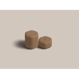 This set features one Medium Capsule (1.32 fl oz) with a blank label and one Small Capsule (0.56 fl oz) with a pill icon. Color: Mocha. TSA-approved.