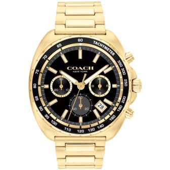 Coach Charter Gents. 44mm Gold IP case, Black Aluminum Tachymetric Bezel. Black Chronograph Dial. Gold IP Bracelet with push button deployment clasp. Mineral crystal. Quartz Chrono movement. Water Resistant to 99 feet.