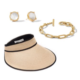 Sophistication and style combine with this Eugenia Kim x Julie Vos Set. Starting with The Trixie Hemp Packable Visor which combines stylish sun protection with unmatched convenience. Crafted from breathable, vented hemp straw, it offers excellent coverage while keeping you cool. The timeless Camel/Black color combination complements any outfit, making it a must-have accessory. Its adjustable one-size design and Velcro closure make it easy to roll up for compact storage in your bag, tote, or luggage. Measuring 2" in height and 6" in width, it's perfectly sized for both function and fashion. Keep it fancy with the Cheval Paperclip Link Bracelet. Elongated oval links textured with braided golden wire, closing with a matched toggle featuring glittering gemstone endcaps. 24K gold plate, CZ. Inner circumference: 7 / 8 inches (adjustable). Width: 0.3 inches. Closes with toggle. Add the final touch with the Honey Stud Earrings. Rose cut sparkling gemstone of imported glass. Lightly hammered bezel setting with gold raised beads. 0.5-inch width.