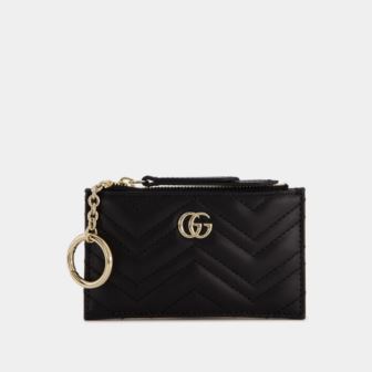 The GG Marmont zip key case showcases Gucci's signature craftsmanship with its matelassé chevron leather in timeless black. Highlighted by the iconic Double G hardware in light gold, this compact accessory offers secure zip closure and a keychain hook, combining practicality with sophistication. Dimensions: 3" H x 0.4"W x 5.1" L