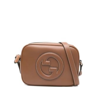 This stylish crossbody bag is crafted of smooth calfskin leather with an interlocking G logo stitched on the front. The bag features an adjustable leather shoulder strap light gold hardware. The top zipper opens to a fabric-lined interior. Dimensions: 5.9" H x 2.75" W x 8.26" L