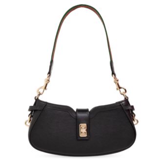 Introducing the 'Moon Side Mini' shoulder bag by Gucci, a masterpiece of elegance and functionality. Crafted from 100% genuine leather, this black-colored accessory boasts a distinctive crescent shape with subtly rounded edges that command attention. The bag's flap is secured with a metal clip closure, meticulously engraved with the designer's logo, affirming the authenticity and prestige of the brand. The adjustable strap is adorned with gold metal elements, enhancing the bag's sophistication. A multicolored stripe, featuring green and red hues, adds a striking contrast to the cream shade, making it a unique statement piece. The interior, lined with 100% premium material, is surprisingly spacious for its size and features a zip closure to safely store your essentials.