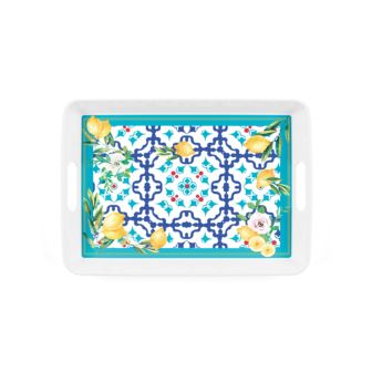 Serve in style with the Table Decor Rectangular Tray with Handles, part of the vibrant Flower&Lemon collection. With dimensions of 2.09" x 18.78" x 13.39", this lightweight melamine tray is BPA-free, dishwasher-safe, and built for both indoor and outdoor use. The integrated handles provide a secure grip, while the impact and thermal shock resistance ensure long-lasting durability. Its floral lemon blossom design adds a bright, fresh aesthetic to every meal-perfect for garden parties, brunches, or breakfast in bed. Whether used as a serving tray or tabletop centerpiece, it effortlessly combines practicality with charm. A must-have for stylish hosting, it brings color and cheer to every occasion.