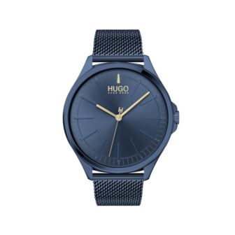 Hugo Black #Smash Gents. Created for the man who likes to mix it up, the HUGO #SMASH collection offers a pared-back design combined with signature details that nod to individuality and creativity. 43mm Ionic Plated Dark Blue Steel Case. Blue Dial. Ionic Plated Dark Blue Steel Mesh Bracelet with sliding buckle. Mineral Crystal. Water resistant to 5 ATM