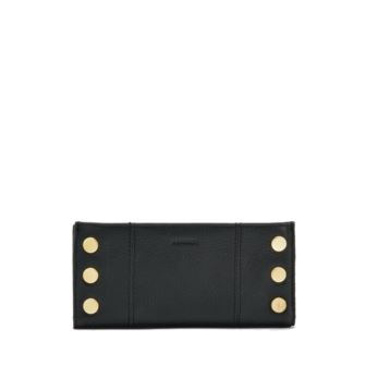 You can't cruise through DTLA without the 110 North. That's why we named our essential folding wallet after LA's fan-favorite freeway, featuring Hammitt's signature combo of buttery black pebbled leather, brushed gold hardware, and a bold red zipper pull. Designed for effortless organization, it includes ten credit card slots, a transparent ID pocket, two drop pockets for currency, and a zippered pocket. The wallet is lined with red cotton twill and secured with a magnetic closure. Compact yet functional, it pairs well with medium to large bags and measures 7.5" L x 0.5" W x 3.5" H. Functionality covered for life.