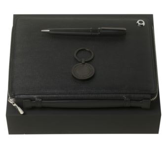 This exquisite and classy looking in black Hugo Boss (Pen pad, Folder A5 & Key ring) includes Conference folder A5 Tradition Black "Tradition" is a line of writing accessories crafted in a fine textured leather. The color palette as well as the metal accents are classically modern, making each of these items' perfect complements to the writing instrument collection. Ballpoint pen Illusion Black, The "Illusion" ballpoint pen is presented with textures and proportions to create an optical illusion, featuring a perfectly balanced silhouette. And lastly, Key ring Framework Black, The "Framework" line is all about contrasts. The rounded silhouette has a classic essence, yet the surface treatments are resolutely contemporary.