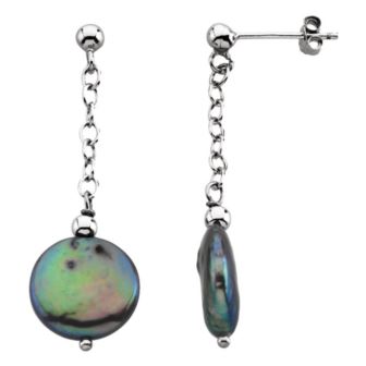 Sterling Silver Freshwater Cultured Black Coin Pearl Earrings- Swirled smoky colors of green, purple and blue Freshwater Cultured Black Coin Pearls mounted in delicate chains of Sterling Silver with Sterling post backs.