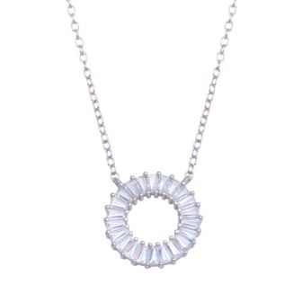 Radiate elegance and cheer with our Rhodium Plated Open Circle Baguette CZ Necklace in 925 Sterling Silver. The open circle design, adorned with baguette-cut cubic zirconia, adds a touch of modern sparkle to brighten up your style. A charming addition to your collection. Rhodium Plated Open Circle Baguette CZ Necklace in 925 Sterling Silver.