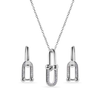 Round Bow Paperclip Clear CZ Necklace-Hoop Earrings Set in Rhodium Plating over 925 Sterling Silver