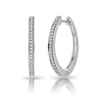 Capture her heart with the delicate allure of these diamond hoop earrings, embraced in the enchanting glow of 10K white gold. Each curve of these hoops whispers of a love story, woven with the timeless elegance of devotion. Adorned with a mesmerizing array of diamonds totaling 0.20 carats, these earrings radiate a gentle sparkle, mirroring the depth of your affection. Set in the captivating hues of IJ color and boasting the clarity of I2, each diamond embodies the purity of your bond, illuminating her beauty with every glance. As she adorns herself with these exquisite hoops, let them serve as a cherished symbol of your unwavering commitment, a promise of forever sealed in the brilliance of the diamonds. Gift her not just jewelry, but a token of your eternal love, destined to shimmer with every step of your journey together.