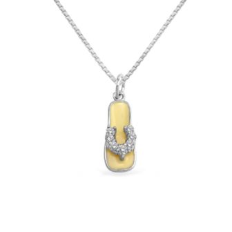 Radiate with elegance and a touch of whimsy with this Rhodium Plated White Enamel Clear CZ Sandal Pendant, delicately suspended from a chain in 925 Sterling Silver. This pendant seamlessly blends the brilliance of clear cubic zirconia with the charm of a sandal design, creating a refined accessory that exudes sophistication and playful allure, making it the perfect choice for adding a unique and stylish touch to your ensemble. Rhodium Plated White Enamel Clear CZ Sandal Pendant with chain in 925 Sterling Silver.