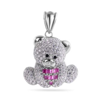 Teddy Bear Red Baguette and Clear CZ Pendant with chain in Rhodium Plating over 925 Sterling Silver