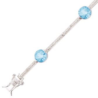 Captivating blue meets dazzling diamonds meets "wow". Blue topaz bracelet with a splash of diamonds, 7mm bezel set genuine blue topaz, .08twt round diamonds, set in sterling silver, 7.25" long with a box clasp. Matches well with earrings JE247, ring JR247 and necklace JN247. Two figure "8" locks for added security.