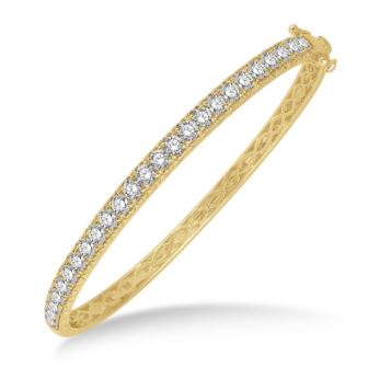 So elegant, so classic, so chic! Bangle bracelet with 2.00twt round diamonds set in 14k yellow gold. This show stopper will keep the compliments coming- comfortable and lovely.