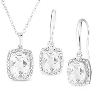 Classic meets contemporary with these romantic 9x7mm genuine white topaz and diamond earrings and 10x8mm white topaz & diamond pendant. .03twt diamonds set in sterling silver. 18" cable chain.