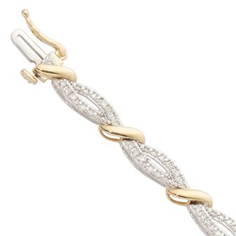 Luxurious diamond bracelet with .50twt round brilliant cut diamonds set in 10k white gold with beautiful yellow gold accents. 7" long with a figure 8 safety lock for added security. Stunning worn alone or pair it with your watch.