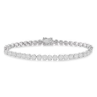 Classic diamond bracelet with a contemporary beat. Our unique setting allows the bracelet to look three times larger than the actual carat weight. 3.00twt round brilliant cut diamonds set in 14k white gold. 7.25" long with a box clasp. Stunning and dazzling and matches well with earrings JE576 and necklace JN576.