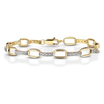Contemporary diamond bracelet with captivating sparkle. .25twt round diamonds set in sterling silver with yellow gold overlay, 7.25" long with a lobster claw clasp.