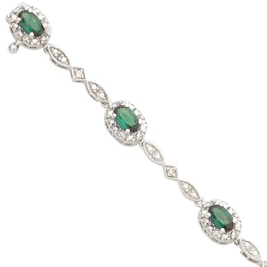 Covet the sacred stone known to preserve love. These beautiful genuine 5x3mm oval emeralds with .05twt round diamond accents are set in a 14k white gold handmade bracelet. 7" long with a hidden safety clasp.
