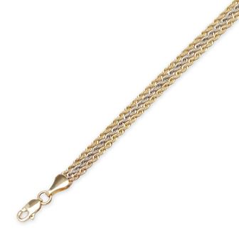 Experience the best of both worlds; white and yellow gold. Ladies triple strand two tone diamond cut rope bracelet, 10k white and yellow gold, 7.25" long with a lobster claw clasp.