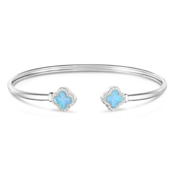 Designer inspired clover cuff bracelet- with opals and white sapphires for added radiance. Sterling silver. Effortless style worn alone or layered